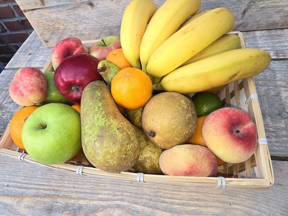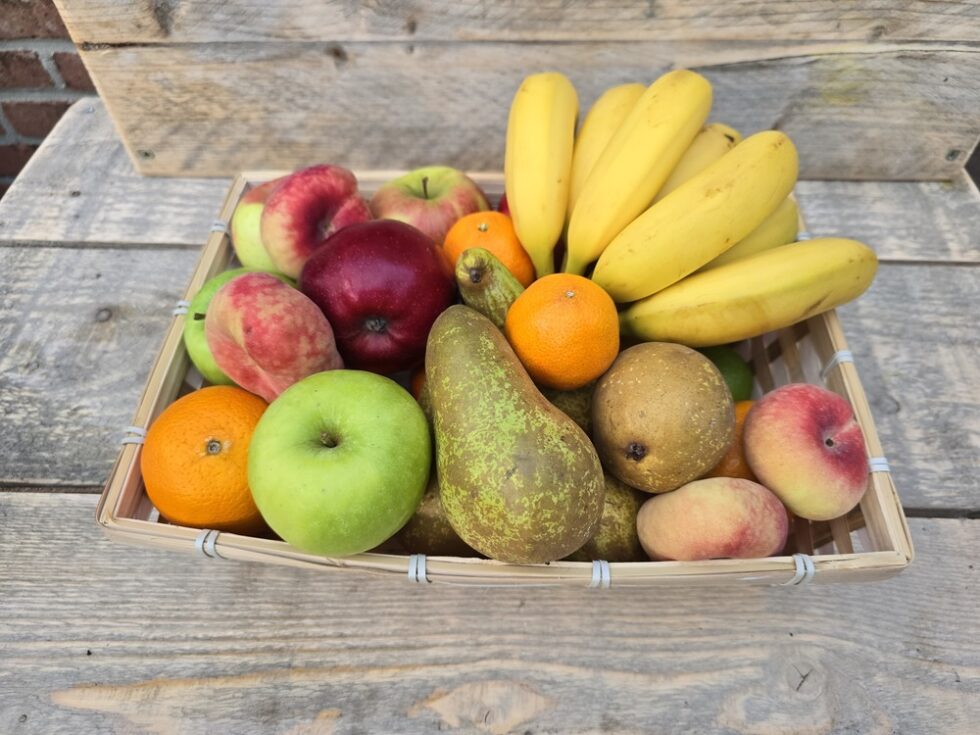 Inhoud: Appels, Mandarijnen, Sinaasappels, Peren, Bananen, snackgroenten (zoals cherrytomaten, mini-paprika’s, komkommer), en een selectie van seizoensvruchten (variërend per seizoen)