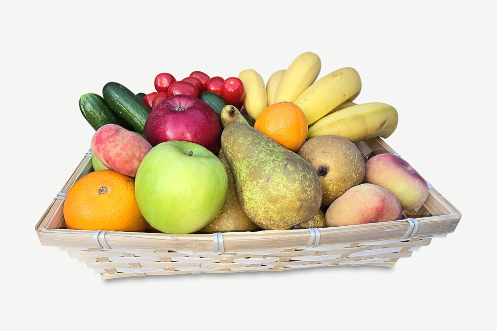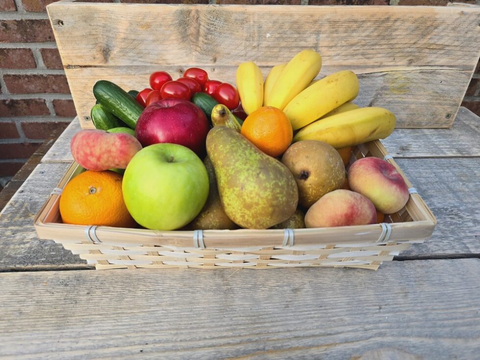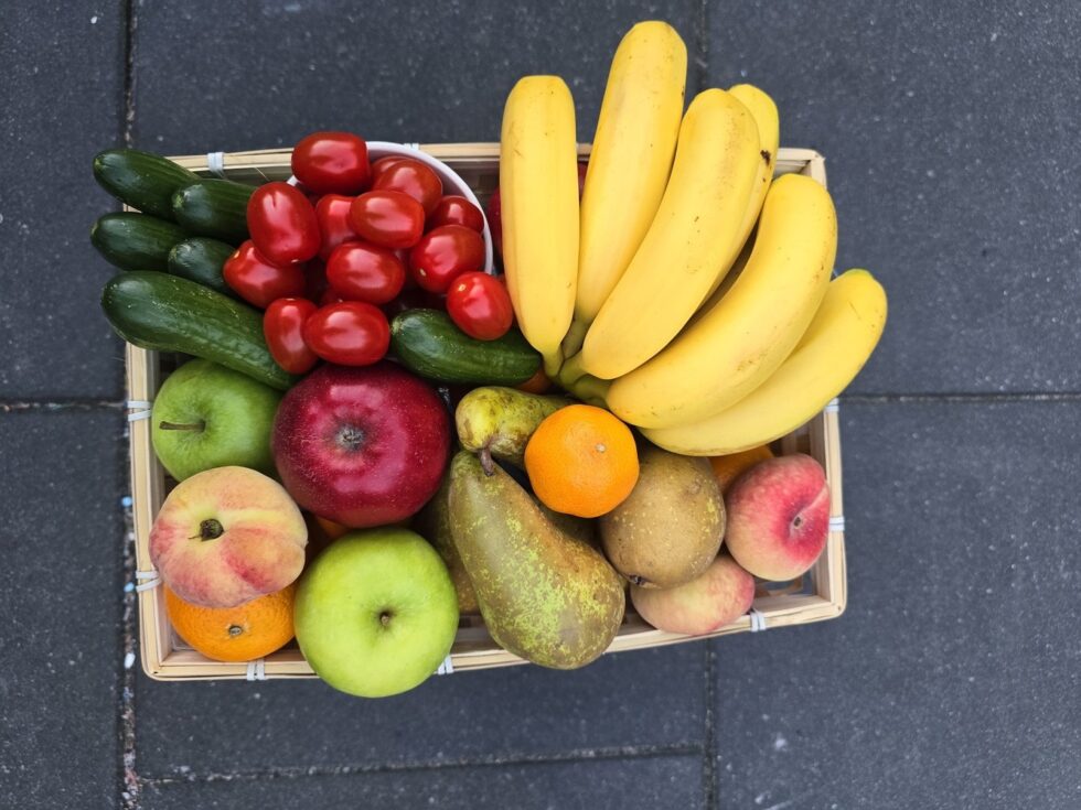 Inhoud: Appels, Mandarijnen, Sinaasappels, Peren, Bananen, snackgroenten (zoals cherrytomaten, mini-paprika’s, komkommer), en een selectie van seizoensvruchten (variërend per seizoen)